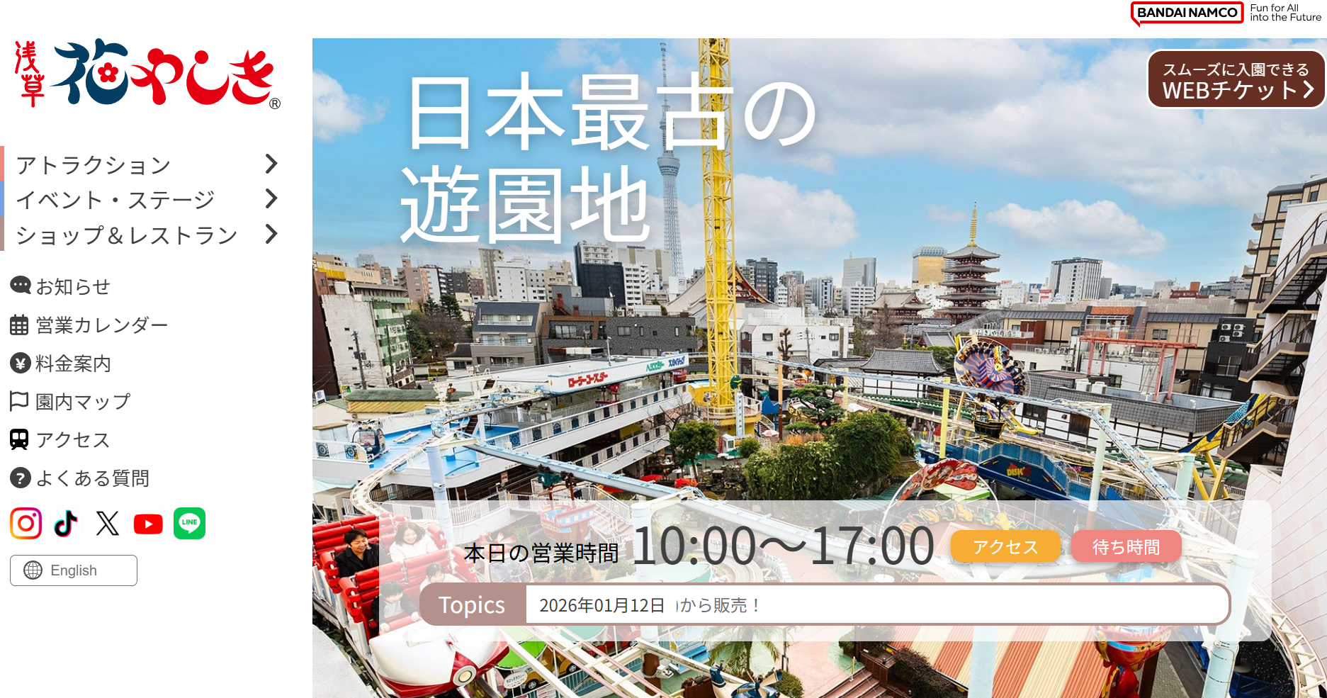 浅草花やしきは、1853年に開園した日本最古の遊園地として知られ、浅草寺から徒歩数分という好立地にあります。レトロな雰囲気が魅力で、観光の合間に気軽に立ち寄れるスポットです。