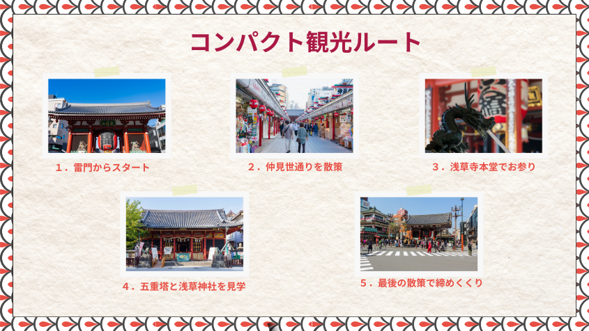 滞在時間が限られている場合は、浅草寺周辺に絞ったコンパクトな回り方がおすすめです。