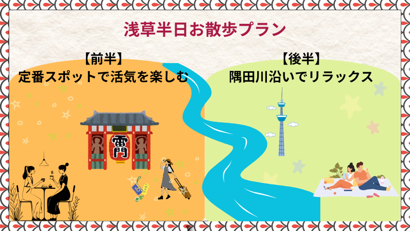 浅草は、滞在時間に合わせて回り方を調整しやすいエリアです。短時間で定番だけを押さえることも、半日かけて寺と川沿いをバランスよく楽しむこともできます。