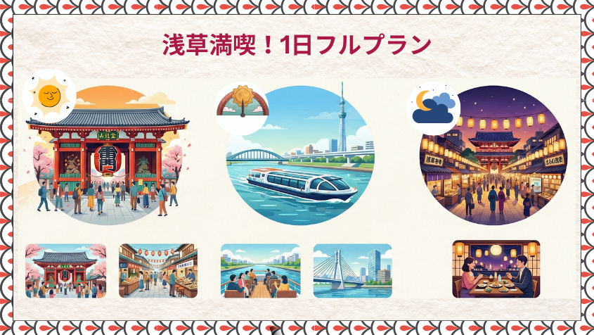 浅草の定番観光と、ゆったりした時間の両方を楽しみたい方には半日コースが最適です。